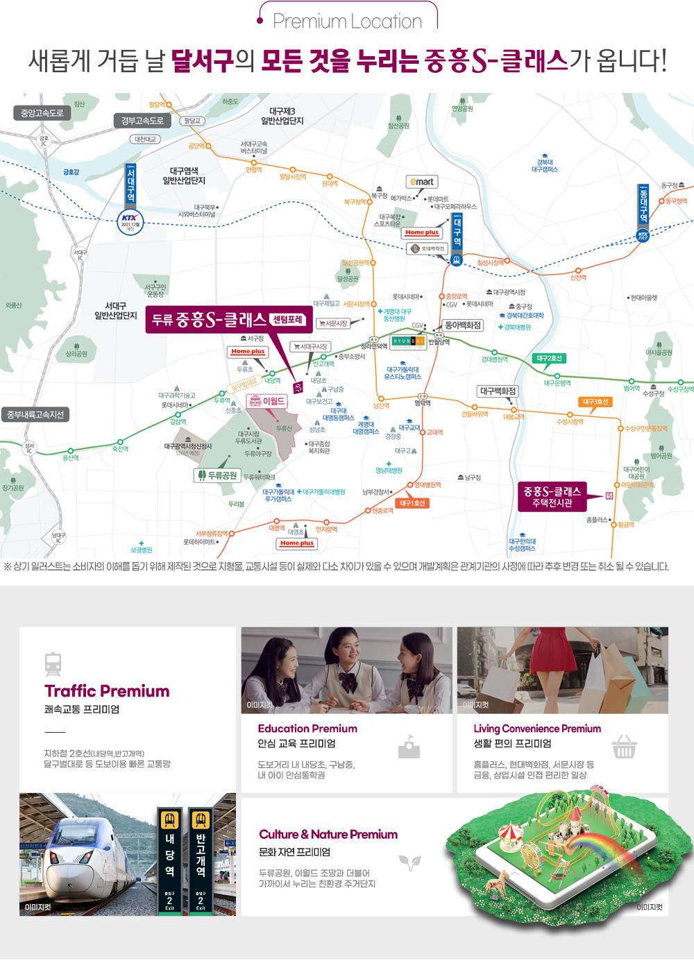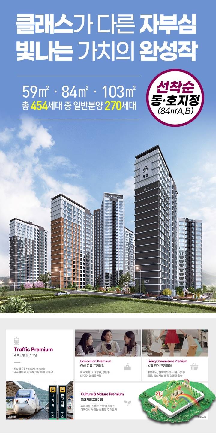 두류역 초역세권의 압도적 입지 대구 지하철 2호선과 내당역을 동시에 누리는 쾌속 교통망 두류역과 내당역을 모두 도보로 이용 가능한 더블 역세권의 가치로 대구 전역을 빠르게 잇는 최고의 교통 편의성을 선사합니다. 두류공원을 품은 쾌적한 숲세권 대구 최대 규모 두류공원을 앞마당처럼 누리는 힐링 라이프 도심 속 거대한 녹지 공간인 두류공원이 인접하여 사계절 변화하는 자연과 함께하는 건강하고 여유로운 삶이 펼쳐집니다. 대구 신청사 이전의 대형 호재 미래 가치가 기대되는 대구의 새로운 중심지 인근 대구광역시 신청사 이전 확정으로 인한 인프라 확충과 지속적인 지역 개발을 통해 주거 가치의 상승이 기대됩니다. 우수한 교육 환경과 안심 학군 단지 인근 초중고교가 인접한 명품 교육 인프라 자녀들이 안전하게 통학할 수 있는 교육 환경과 다양한 학원가가 형성되어 있어 학부모님들의 만족도가 매우 높습니다. 중흥S클래스만의 명품 브랜드 가치 특화 설계와 고품격 커뮤니티로 완성되는 주거의 정점 중흥건설의 노하우가 집약된 차별화된 평면 설계와 입주민을 위한 다채로운 커뮤니티 시설로 삶의 질을 한 차원 높여줍니다. 편리한 도심형 원스톱 인프라 홈플러스, 롯데시네마 등 쇼핑과 문화를 가깝게 쇼핑 시설부터 문화 시설까지 풍부하게 갖춰진 단지 주변 환경으로 일상의 모든 필요를 단지 근처에서 해결하는 편리함을 제공합니다.